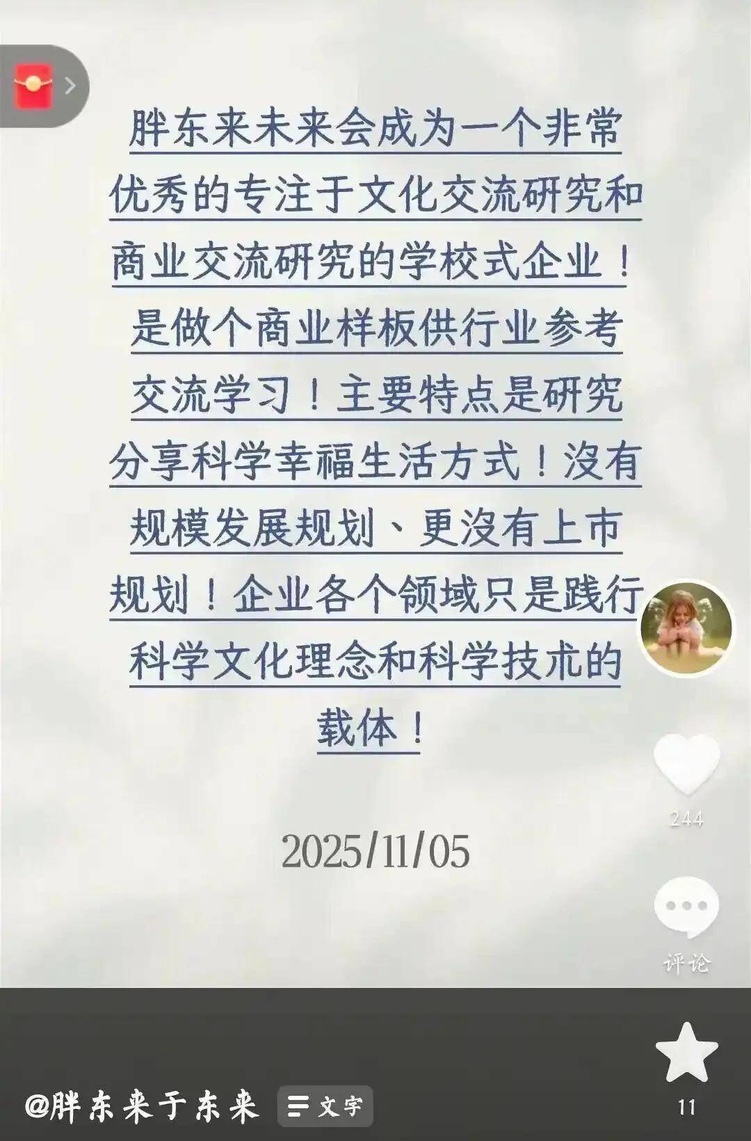 【于东来发文回应“胖东来上市”】11月5日,于东来在社交平台发布图文称,胖东来没有规模发展规划、更没有上市规划。于东来称,胖东来未来会成为一个专注于文化交流研究和商业交流研究的学校式企业,是做个商业样板供行业参考交流学习。(大象新闻)